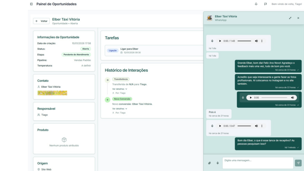 Cada conversa passa a gerar uma oportunidade com nome, telefone, origem e histórico organizado.